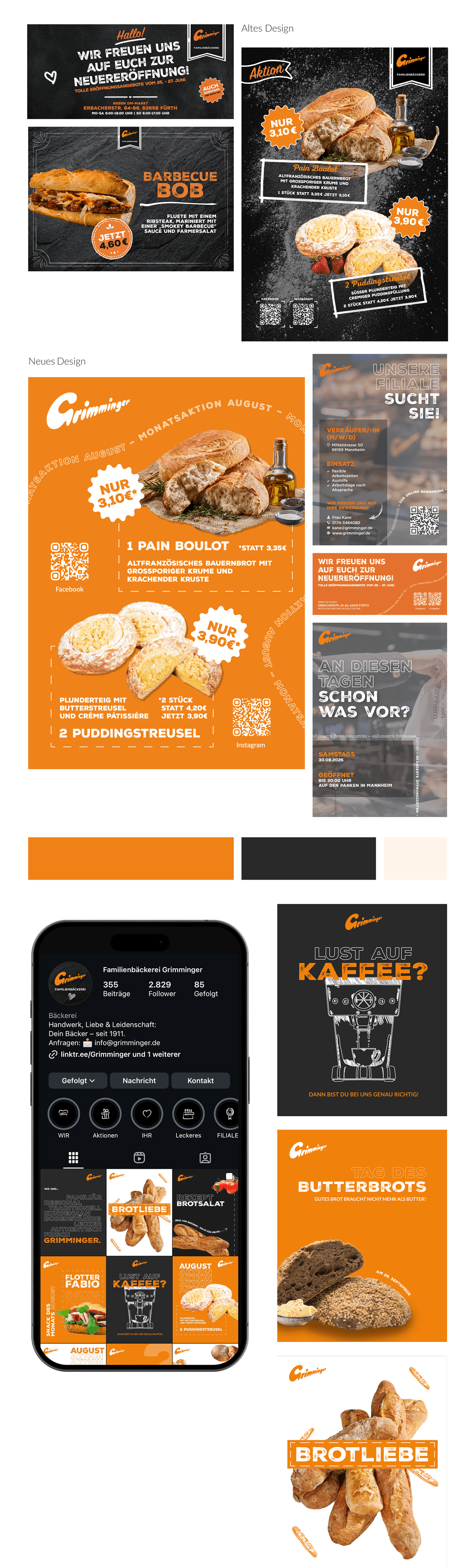 Die Familienbäckerei Grimminger steht seit Jahrzehnten für handwerkliche Backkunst – und wir dürfen die Traditionsbäckerei mit frischem Content und Design begleiten. Neben der dauerhaften Betreuung der Social-Media-Kanäle Instagram & Facebook entwickeln wir regelmäßig grafisches Material für die Filialen: von Aktionsplakaten und Stellenausschreibungen bis hin zu saisonalen Kampagnen, die direkt am Point of Sale Wirkung zeigen. Ein besonderes Highlight für unser Grafik Team war ein Re-Design von Social Media Posts und Marketingmaterialien im Sommer 2025. Ziel war es, das Erscheinungsbild ansprechender, lebendiger und authentischer wirken zu lassen – und damit die Marke auf allen Ebenen zu stärken. Von der Farbwelt bis zur Bildsprache haben wir dem Auftritt ein modernes Gesicht gegeben, das die Werte von Grimminger widerspiegelt und die Traditionsmarke für die Zukunft rüstet. Darüber hinaus durften wir uns auch bei der Namensfindung neuer Produkte kreativ einbringen – und so sicherstellen, dass jede neue Kreation nicht nur geschmacklich überzeugt, sondern auch kommunikativ perfekt ins Markenbild passt.